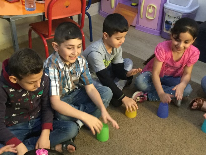 As you can see we are very focused on an activity that not only encourages motor skills, social skills but also listening and response in time to a certain beat in the music. Maybe you can try it yourself at home? Pass the cup to the person next to you in time with the music. The more complicated versions enable you to cross hands, swap sides and change direction!